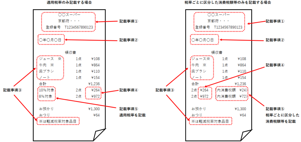 適格請求書の記載事項と比べると⑥「書類の交付を受ける事業者の氏名又は名称」の記載が不要である点、⑤「税率ごとに区分した消費税額等」又は「適用税率」のいずれか一方の記載で足りる点が異なります。